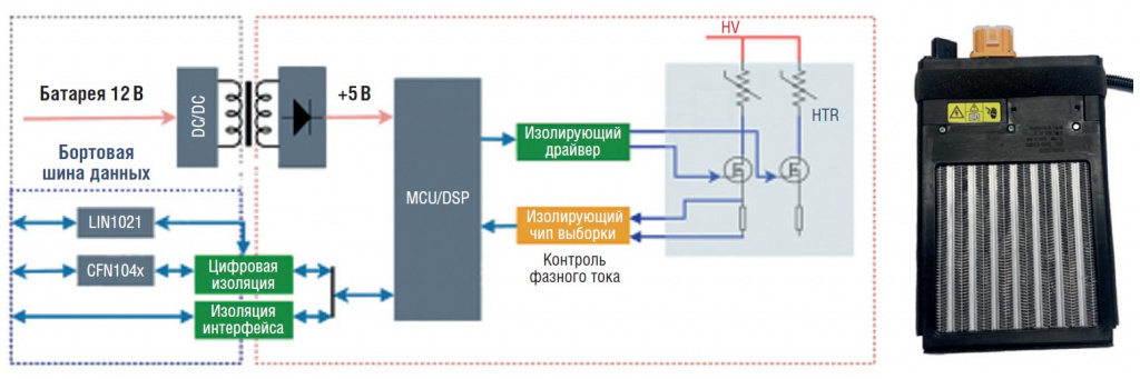 Как уже отмечалось, в электромобилях PTC-нагреватель (HTR) питается от высоковольтной аккумуляторной платформы транспортного средства (HV), а MCU/DSP – от источника 5 В постоянного тока (рис. 2). В системе присутствуют два основных компонента, обеспечивающих безопасную координацию между низковольтным управлением и высоковольтным нагревом: